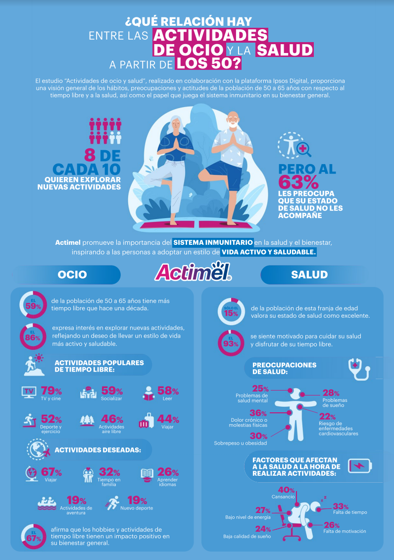 El sistema inmunitario es fundamental para disfrutar plenamente de los momentos de ocio y mantener una vida saludable. En este marco, Actimel ha llevado a cabo el estudio “Actividades de ocio y salud”, realizado en colaboración con Ipsos y dirigido a la población española entre 50 y 65 años, con el objetivo de descubrir cuáles son los hábitos y creencias relacionadas con el tiempo libre y la salud.